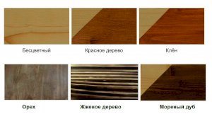 Цвета на выбор: бесцветный, клён, орех, красное дерево, морёный дуб, жженое дерево.