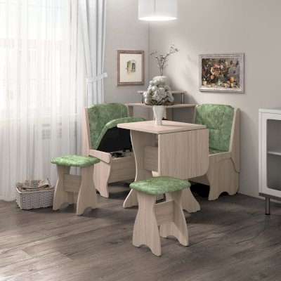 Можно самим собрать уголок из диванчиков нужного Вам размера - двух больших, двух малых или разноразмерных, как в классическом варианте, подобрать любой понравившийся кухонный стол, табуреты или стулья.